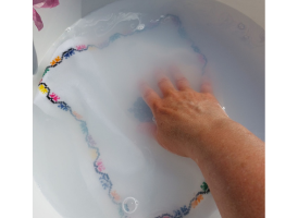 Prostírání, povlak na polštář nebo náramek v připravené lázni promnete, až do okamžiku, kdy máte pocit, že je čistý. Dále vymácháte v čisté vodě.