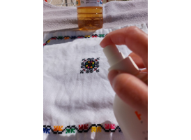 Zabalíte do osušky a jemným kroucením vyždímáte. Rozložíte na sušák a výšivku postříkáte z rozprašovače octem. Toto se dělá pro oživení barev výšivky.