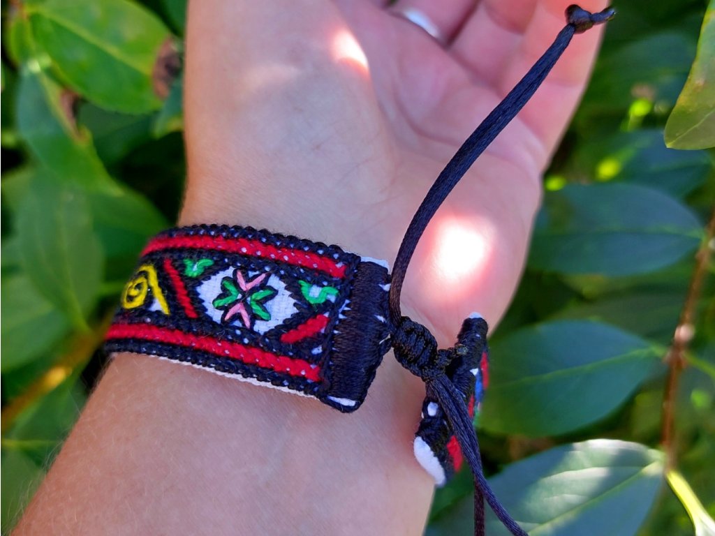 Plátno i vyšívací bavlnky jsou ze 100 % bavlny. Zavazování je na klouzavý uzlík ze saténových šňůrek v černé a červené barvě, které korespondují s hlavními barvami výšivky.
