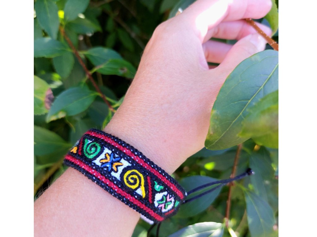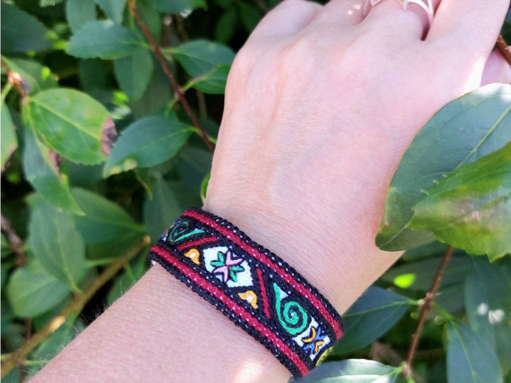 Makovička sedí v kolíbce z hádzíků. Spirálově zatočený motiv hadů (hádzíků), nám říká, že nikdy nic nekončí, vše se opakuje a láska je věčná. Makovičky v tomto vzorku, přináší vědomí hojnosti a dostatku pro všechny. Náramek je vhodný pro ženy.
