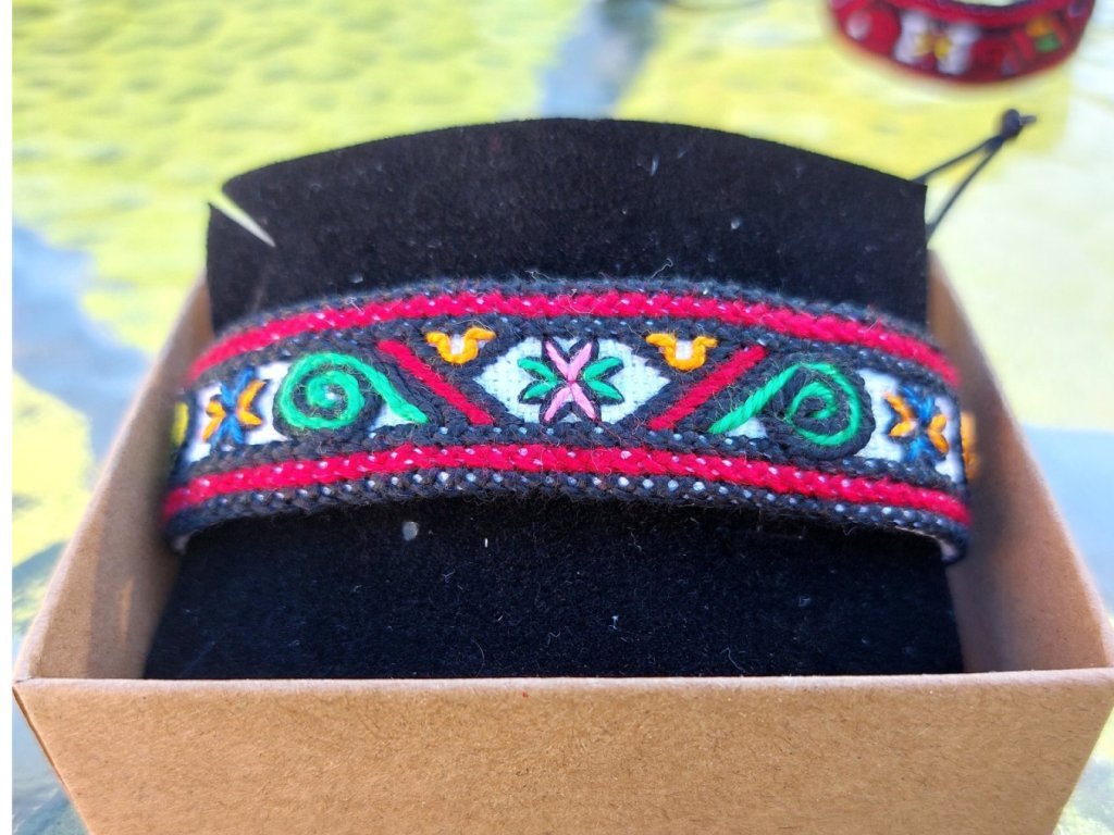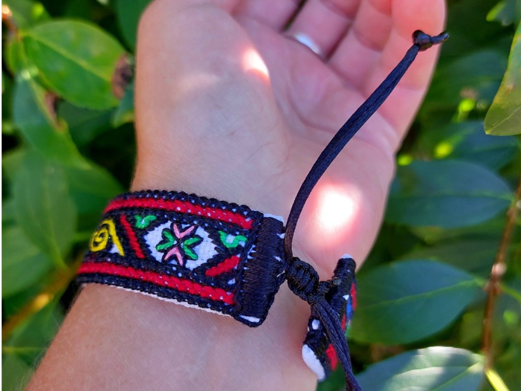 Zavazování je na klouzavý uzlík ze saténových šňůrek v černé a červené barvě, které korespondují s hlavními barvami výšivky.