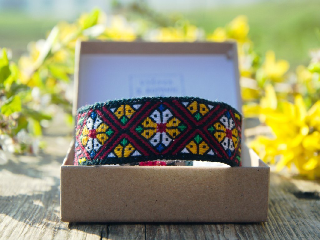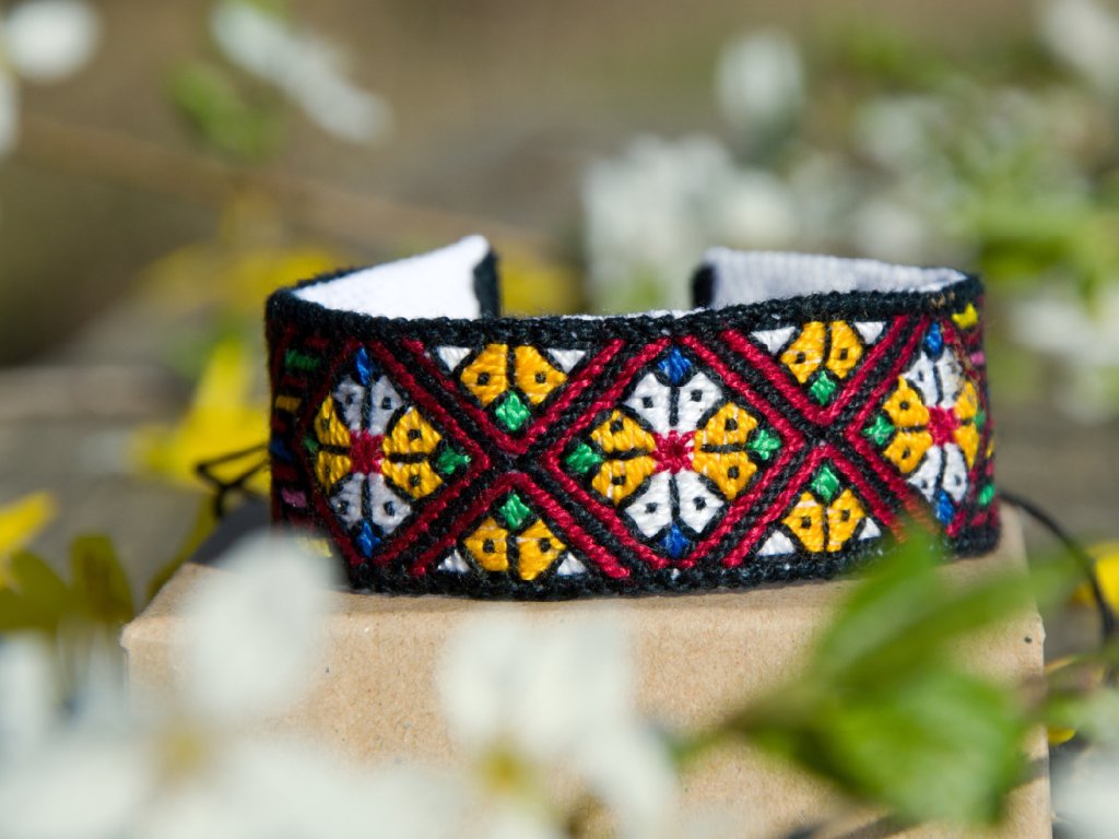 Náramek s motivem sedzmeréj zaceliny bude ochraňovat a je nositelem štěstí. Zacelinky a pól zacelinky tvoří jeden obrazec. Uprostřed vidíme květinku vytvořenou z barevných drahokamů - oranžová, bílá, zelená, modrá. Zároveň se spojují a přecházejí do jiného tvaru. Všechno je spojeno se vším a různé díly spolu vytváří jiný celek, s jiným smyslem.