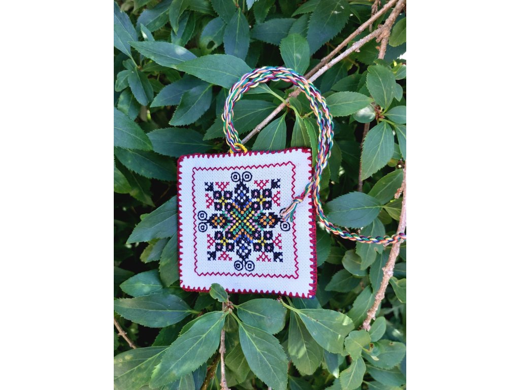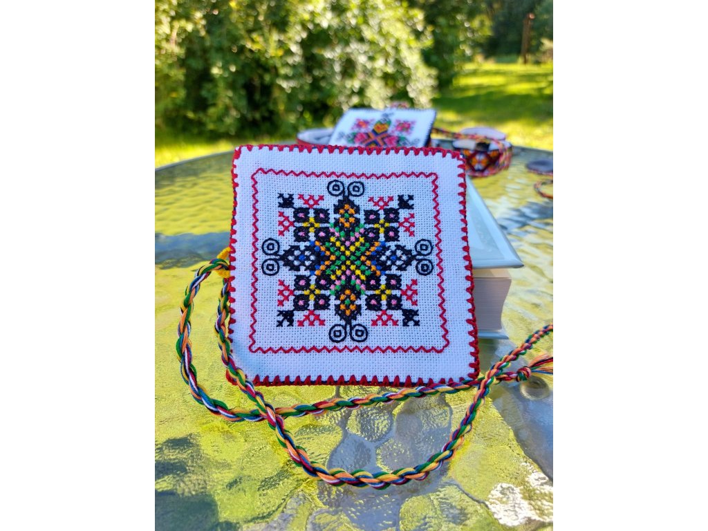 Zadní strana je z modrého plátna a záložku doplňuje motaná šňůrka z bavlnek použitých na výšivku.