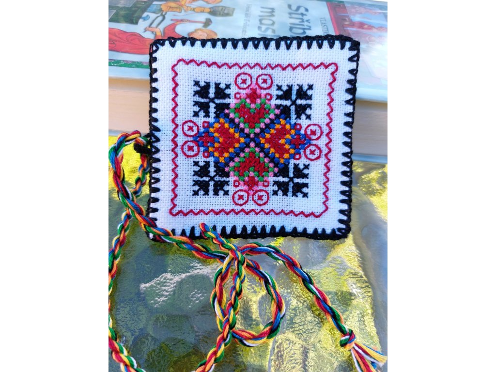 Květ je v černé variantě, zadní strana je z modrého plátna a záložku doplňuje motaná šňůrka z bavlnek použitých na výšivku.