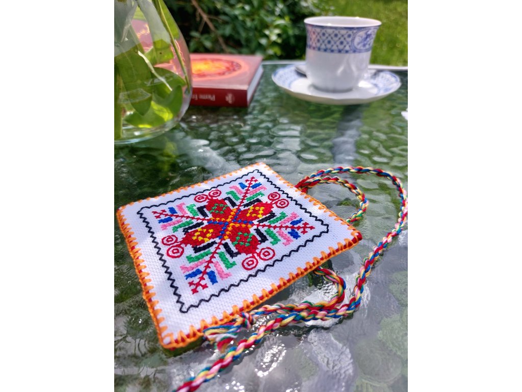 Zadní strana je z červeného plátna a záložku doplňuje motaná šňůrka z bavlnek použitých na výšivku.