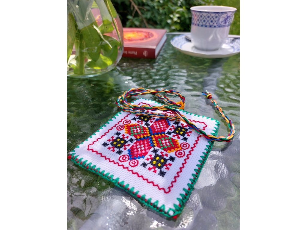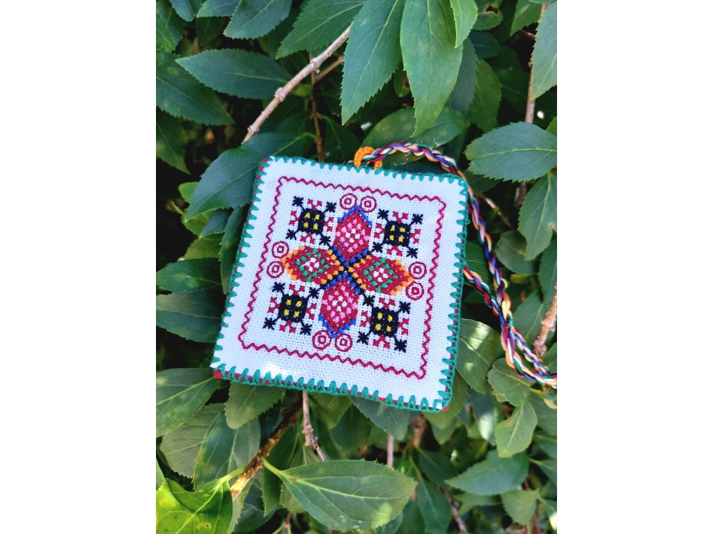 Plátno i vyšívací bavlnky jsou ze 100 % bavlny. Zavazování je na klouzavý uzlík ze saténových šňůrek v černé a červené barvě, které korespondují s hlavními barvami výšivky.